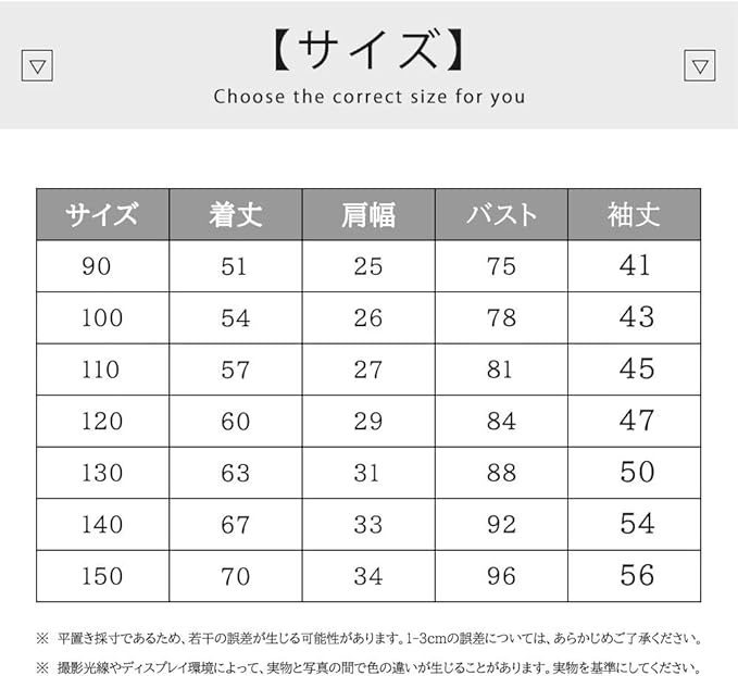- 【90】目安身長:80-90cm 【100】目安身長:90-100cm 【110】目安身長:100-110cm 【120】目安身長:110-120cm 【130】目安身長:120-130cm 【140】目安身長:130-140cm 【150】目安身長:140-150cm 【Tips】成長期のお子様は、1-2サイズ大きいサイズをお選びいただくことをお勧めします