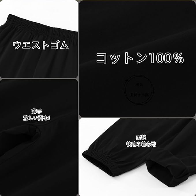 - 通気性と吸水性が素晴らしい綿素材は最高です。薄手で夏にはピッタリです。虫防止、クーラーなどよく使えます。ウエストと裾はゴムで、伸びがあります。縫製も丁寧しております。