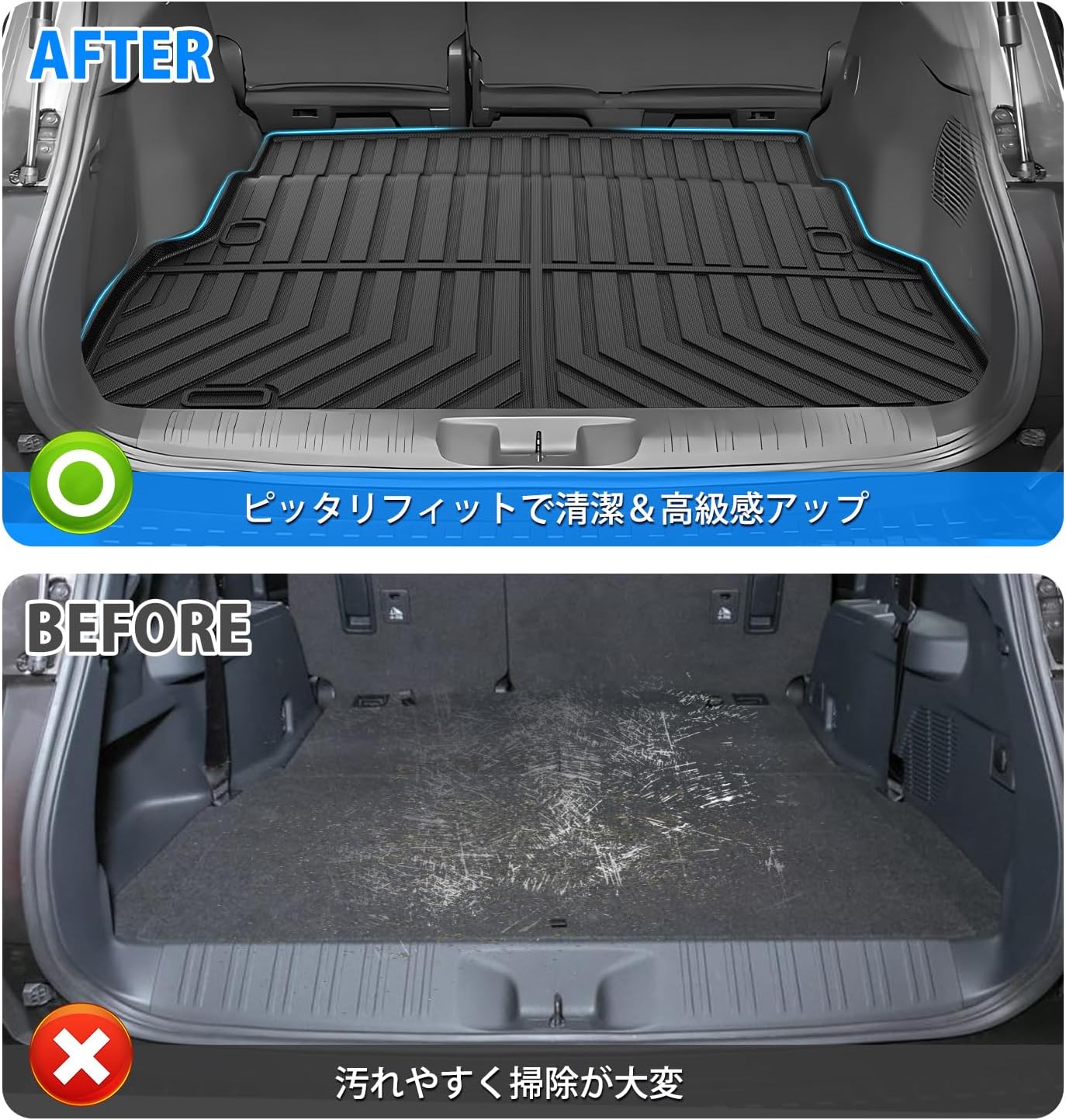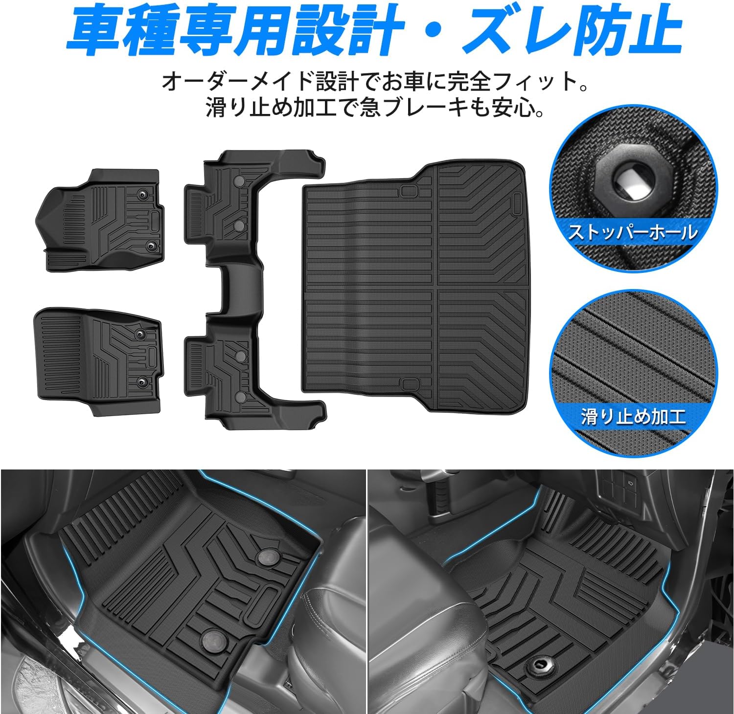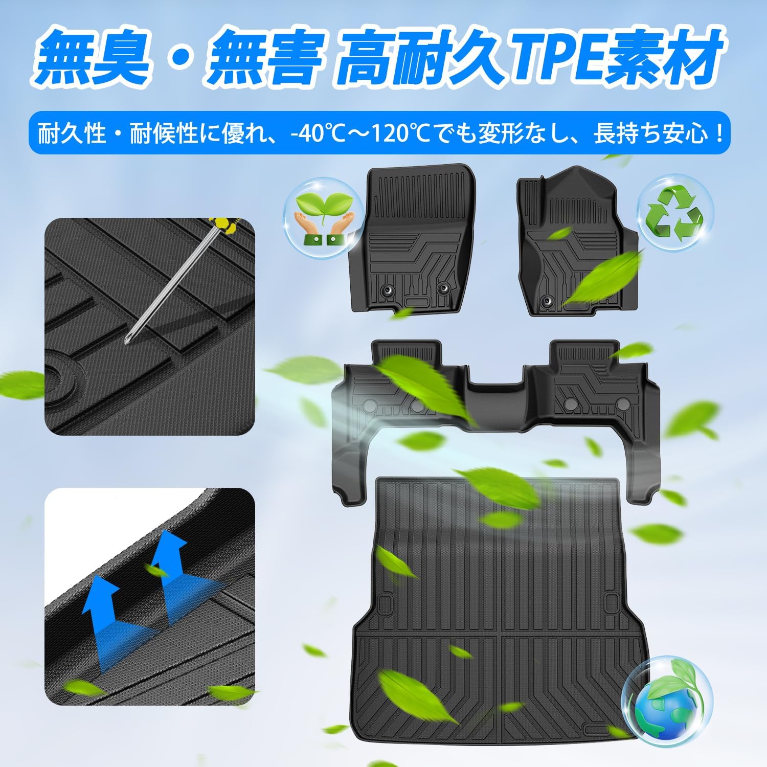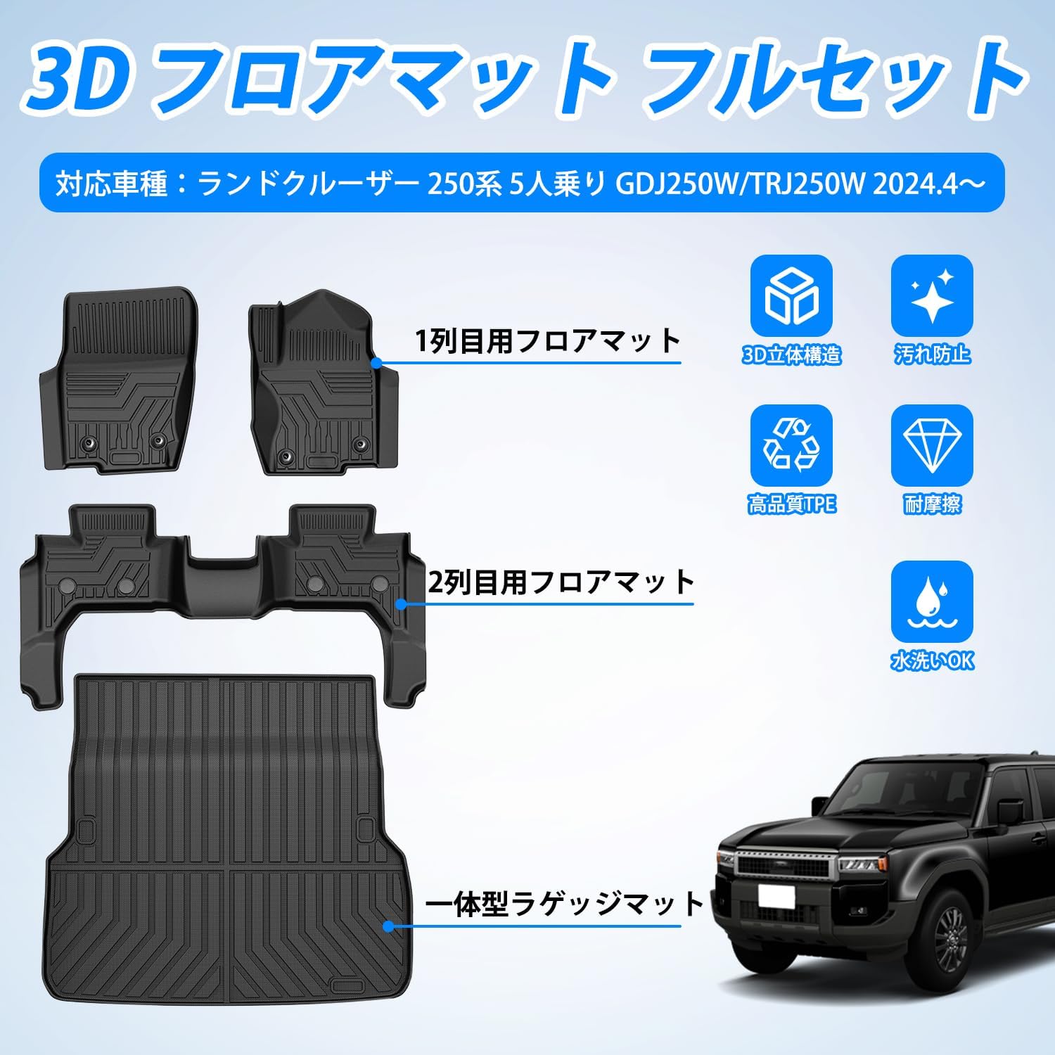 - 1.【対応車種】トヨタ 新型 ランドクルーザー 250系 5人乗り対応;型式:GDJ250W/TRJ250W型;年式:2024年4月~現行;セット内容:1列目用フロアマット×2枚、2列目用フロアマット×1枚、一体型ラゲッジマット×1枚。