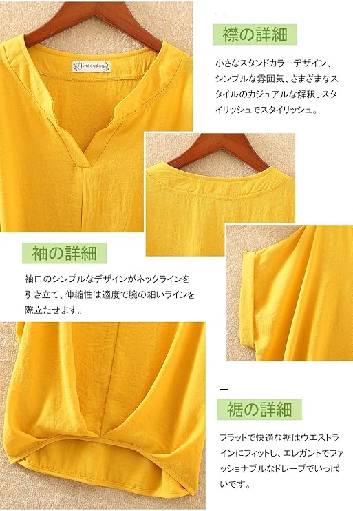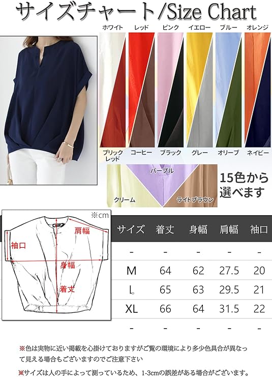 Product Description この商品について デコルテを綺麗に見せるVネック、二の腕をさりげなくカバーしてくれるするドルマンスリーブ、ゆったりと着れるシルエットが魅力です。 綿麻素材なのでサラサラとした着心地、見た目にも涼しげな印象を演出します。 合わせるボトムスによってきれい目にもカジュアルにも着回しOK。スッキリしたパンツに合わせるとオフィスでも活躍しそうです。 【サイズ】●M 着丈62cm肩幅60cm袖丈14cm ●L着丈63㎝肩幅61㎝袖丈15㎝ ●XL着丈64㎝ 肩幅 62cm袖丈16cm オフィス、デートやパーティ、結婚式、二次会、お呼ばれ等 幅広く活躍して頂けます。またお尻が隠れる嬉しい着丈感なので年齢(10代、20代、30代、40代、50代)問わずお使いいただけます。