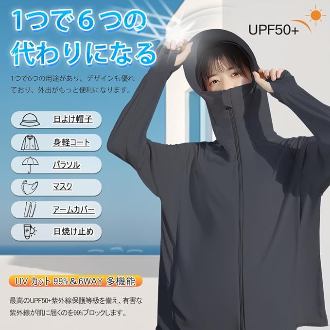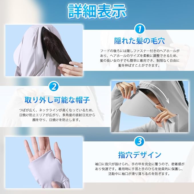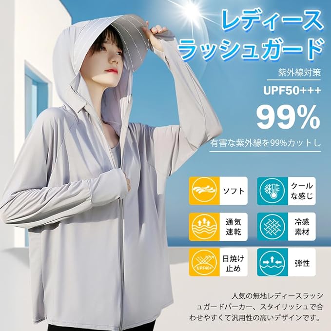 Product Description この商品について 【着用サイズ】【M: 身長の目安:150-160cm 体重:40-50kg】【L: 身長の目安:160-170cm 体重:50-60kg】【XL: 身長の目安:165-175cm 体重:60-70kg】※手で測りますので、1-3cmの誤差があるかもしれません。※サイズを選択する時サイズ表を参照してください。冷感素材とシルクのような肌触りの良い糸で仕上げた薄くて涼しい通気性抜群の生地を採用。吸汗、速乾、吸湿性能に優れています。伸縮性がある生地のため、ストレスなく着用できます。シンプルなカラーだから幅広い方にオススメ、お友達やご家族へのギフトとしても最適です! 【UVカット99%&6WAY多機能】日焼け止め対策が不十分だと、シミやシワ、皮膚の老化、肌の黒ずみや日焼けによる赤みなどの肌トラブルが生じる可能性があります。このラッシュガードはUVカット性能の最高ランクUPF50+でお肌に有害な紫外線を99%カット!UPF50+の保護指数を誇り、マリンスポーツやアウトドアスポーツ中に紫外線ダメージから身を守ることができます。1つで6つの代わりになるので、日よけ帽子・身軽コート・パラソル・マスク・アームカバー・日焼け止めクリームとして使えるようにいいデザインです、外出がより便利になります。 【細部までこだわった性能&360°日焼け防止】キャップのつばを広くした取り外し可能なデザインをアップグレードし、ハイネックを搭載し、日焼け止め面積を拡大し、直射日光の颜を多角的に遮蔽し、日焼け防止。フロントファスナーは顔まで伸ばしているので、ケアしづらい首と顔もラッシュガードで肌を守ります。指穴付きになったデザインで、手の甲をしっかり覆うことができます。この帽子は後ろにジッパーが付いており、女性のロングヘアでもしっかりとかぶることができ、拘束感や蒸れ感がありません。 【接触冷感&通気速乾】柔らかく、滑らかで涼しげな素材を使用、通気性の良い素材を使用するこのラッシュガードは、肌から湿気を吸収し、自由な動きと一日中のコンフォートを保証します。熱や湿気を素早く放出する冷感素材設計であり、ムレずに肌を快適な状態に保ちます、暑い季節もひんやり快適に過ごせる。素肌に着るラッシュガードだからこそ、着心地の良さ、肌触りにもこだわりました、で真夏でも爽やかな着心地です。カバンなどに入れて持ち運びもしやすい軽量さは夏のマストアイテム! 【幅広く適応シーン】人気の無地レディースラッシュガードパーカー、スタイリッシュで合わせやすくて汎用性の高いデザインです。海やプールに行く時、水着のアウターとしてはもちろん、通勤通学の時も日焼け止め用服としてtシャツの上に羽織るのもいいですし、寒すぎる冷房の中に必須のアウターとしても便利です。アウトドアや日常での日焼け対策にも大丈夫です、旅行の移動時やキャンプ、アウトドア、ランニング・スポーツウェアなどたくさんのご利用シーンで活躍。お届いた商品についてなにか問題がありましたらお気軽にご連絡をお願い致します。お客様に最高のアフターサービスを提供することを約束します。