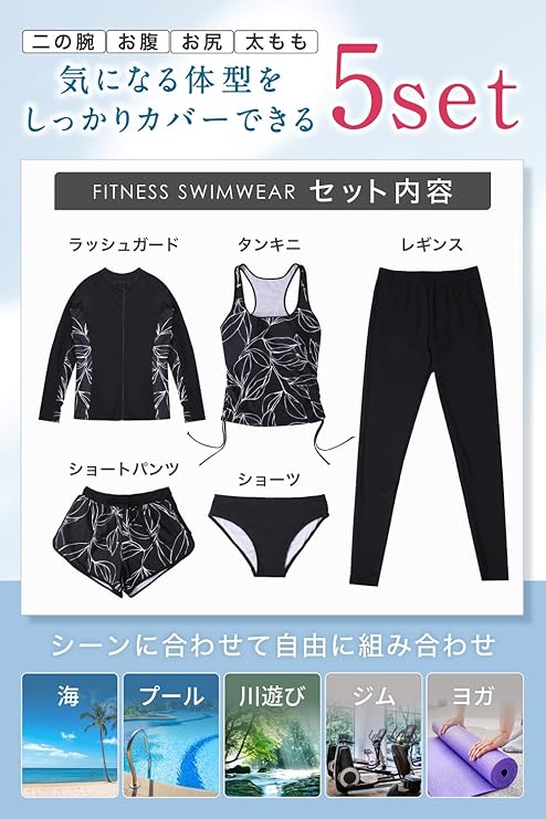 Product Description この商品について ✅【国内第三者検査機関にてUVカット率100%の実証済】日本の国家規格、JIS規格1925にてUVカット率100%を実証。日差しから肌を守りたい方のために開発したUVカット水着です。 ✅【様々なシーンで大活躍の5点セット】タンキニ、ラッシュガード、ショートパンツ、ショーツ、レギンスの5点セットです。海、プール、ジム、フィットネスなどいろんな場面でご利用いただけます。 ✅【豊富なサイズ展開】様々な体型の方にお選びいただけるよう、S~5Lの7サイズをご用意しております。ご購入の前にサイズ表のご確認をお願いいたします。 ✅【嬉しいストレスフリー設計】タンキニはノンワイヤーを採用し、ワイヤーが苦手な方にも快適に着ていただけるつくりになっております。 ✅【簡単調節】タンキニのアンダーは3段階の調節が可能で動きやすく身体にぴったりフィット。ウエストも調節ゴム付きで簡単にサイズ調節ができます。