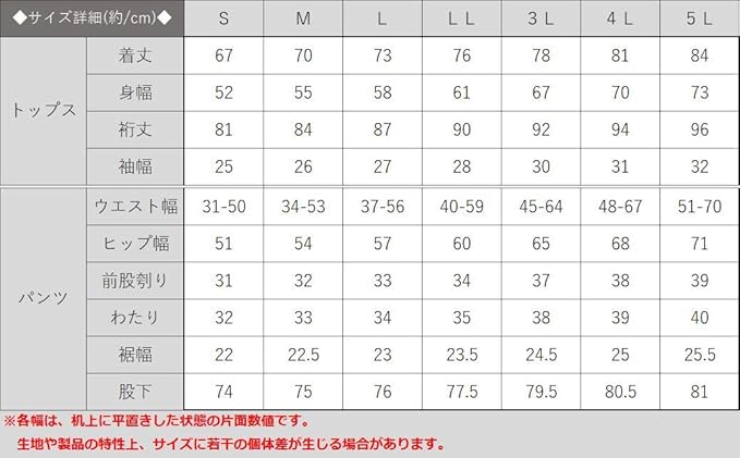 Product Description この商品について 生産国: 中国 身長目安: [S] 155-165cm / [M] 165-175cm / [L / LL(XL) / 3L / 4L / 5L] 175-185cm 胸囲目安: [S] 80-88cm / [M] 88-96cm / [L] 96-104cm / [LL(XL)] 104-112cm / [3L] 112-120cm / [4L] 120-128cm / [5L] 128-136cm ウエスト目安: [S] 68-76cm / [M] 76-84cm / [L] 84-94cm / [LL(XL)] 94-104cm / [3L] 104-114cm / [4L] 114-124cm / [5L] 124-134cm 仕様: [トップス] 前面ジップアップ, 左右ポケット / [ボトムス] ウエストゴム, 縛り紐有り, 左右ポケット