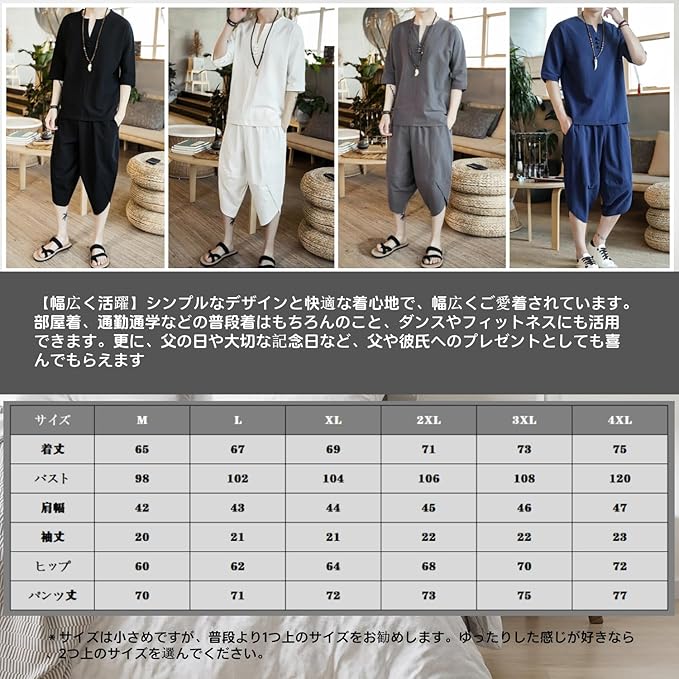 Product Description この商品について ✅ゆったりとしたシルエットを取り入れ、体型を見事にカバーしながら、窮屈感もなく自由自在に動けます。年代を問わず、誰でも楽々に着こなせます。また、特別な衿デザインで、さりげなく個性を引き出せます。 ✅半袖tシャツ&ハーフパンツならではの開放感で、 穿くだけで涼しい!上下別々で着てもお洒落に着こなします。セットアップで旬の男らしさもカジュアルさも手に入れます。 ✅夏を遊ぶ旬コーデで、着回し自在、年齢を選ばず、日常着・通勤通学・部屋着・カジュアルコーディにもスポーツ・アウトドアにも活躍できるジャージメンズ上下セットです。 ✅質な素材より作られ、柔らかくて肌触りがよく、涼しく夏を過ごせます。また、吸湿性と通気性を兼ね備え、汗をかいても不快感なく、さっぱりとした着用心地を楽しめます。更に、縮みや型崩れが起きにくく、長持ちして着用いただけます。 ✅サイズは小さめですが、普段より1つ上のサイズをお勧めします。ゆったりした感じが好きなら、2つ上のサイズを選んでください
