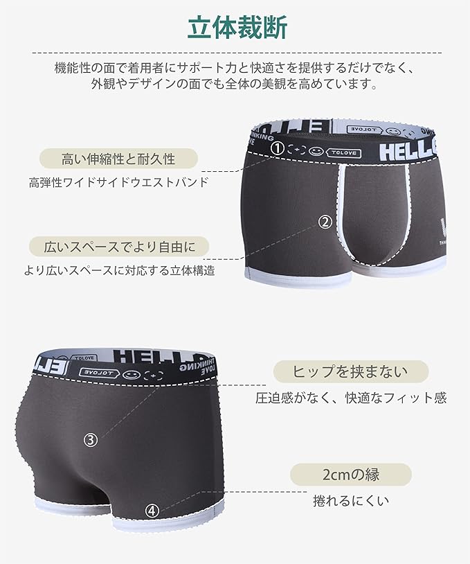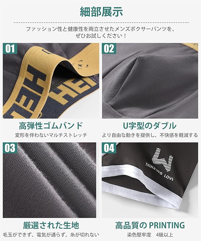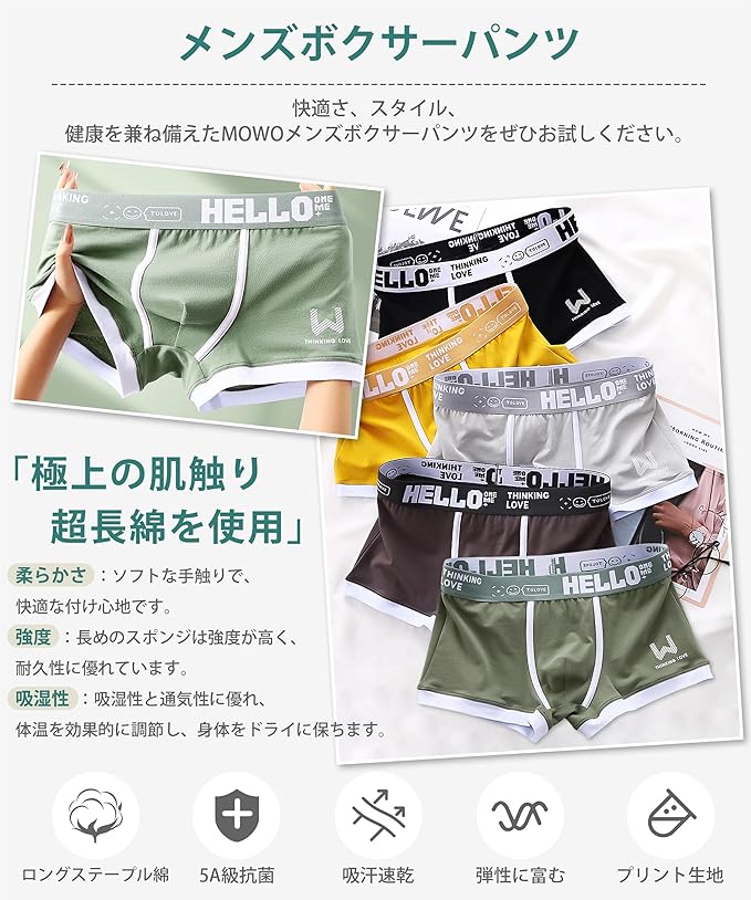 Product Description この商品について 【素材構成・サイズ】 素材:コットン95%、マルロン5%; メンズボクサーパンツは、極上の肌触りを実現した超長綿を使用しており、柔らかくしなやかな着心地が特徴です。コットン素材は静電気が発生せず、毛玉ができにくく、季節を問わず着用できます。メンズボクサーパンツ サイズ:M=(40-50kg);L=(50-60kg);XL=(60-70kg);2XL=(70-80kg);3XL=(80-90kg)。※ボクサーパンツはサイズがやや小さいため、購入する際は通常のサイズより1~2サイズ大きいものを選ぶことをおすすめします。 【腰の窮屈感なし・快適な履き心地】メンズボクサーパンツは高い伸縮性を持つ素材と丁寧な縫製によって、ずれや引き上げの心配がなく安心して着用いただけます。アクティブな一日を過ごしても、快適さを保ちながら、腹部を適度にサポートし、安定感を提供します。ボクサーパンツのウエストバンドは伸縮性に優れ、長時間使用しても緩むことはありません。ボクサーパンツの裾はカール防止加工が施されているため、快適な履き心地で足を締め付けません。 【吸汗速乾・通気メシュ】メンズボクサーパンツは非常に柔らかな肌触りを持ち、優れた通気性と吸湿性を備えています。これにより、体からの汗をしっかりと吸収し、素早く外に放出します。汗が気になる季節でも、安心して快適に着用できるパンツです。ボクサーパンツのクロッチ部分には通気孔が多数設けられており、通気性を確保しながら臭いの発生を防ぐため、一日中着用していても蒸れを感じさせません。 【3D立体裁縫・人間工学】MOWOメンズボクサーパンツは立体構造になっており、局部的なサポート力を発揮し、摩擦を減らしてフィット感を高め、着用感を向上させます。パンツのクロッチ部分は、日本人の体型に合わせたメンズ人間工学的に正しいU字型のダブル・デザインで、運動時により自由な動きを提供し、不快感を軽減します。立体的なデザインはより現代的で、メンズボクサーパンツの視覚効果を高め、パーソナライズとファッションの需要に応えています。 【5A級抗菌・安全染料】メッシュ生地を使用した襠の二重構造は、効果的に異臭の発生を減少させ、メンズボクサーパンツを清潔で衛生的に保ちます。抗菌率は99%に達し、細菌の繁殖によって引き起こされる皮膚の不快感やその他の健康上の問題を元から解決します。このパンツは反応性プリントと染色技術で作られており、染色堅牢度は4級以上で、洗濯を繰り返してもプリントの色が落ちることはありません。ファッション性と健康性を両立させたメンズボクサーパンツを、ぜひお試しください! 【30日間返金保証】ご購入日から30日以内に、ご満足いただけない場合は全額返金いたします。リスクフリーな購入をお約束します。破損が起こった場合、予めメールでご連絡ください。