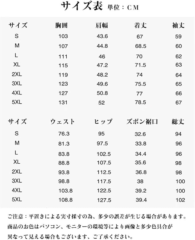 - 【大きいサイズ対応のメンズスーツ】★ご注意:スリムタイプなので、ゆったり好きな方はワンサイズアップご注文ください。★セット内容:スーツジャケット+ 長ズボン。M:目安身長と体重→160-165cm/50-55㎏、L:目安身長と体重→165-170cm/55-60㎏、XL:目安身長と体重→165-170cm/61-70㎏、2XL:目安身長と体重→170-175cm/71-75㎏、3XL:目安身長と体重→170-175cm/76-80㎏、4XL:目安身長と体重→175-180cm/82-87㎏、5XL:目安身長と体重→175-180cm/88-96㎏。