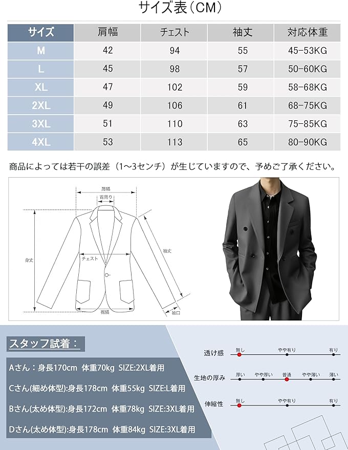 - [3色&6サイズ] 幅広いサイズに、カラーも様々取り揃えています。3色展開、コーデの幅が広がります。m l xl 2xl 3xl 4xlまで6つのサイズを用意してカジュアルスーツ。